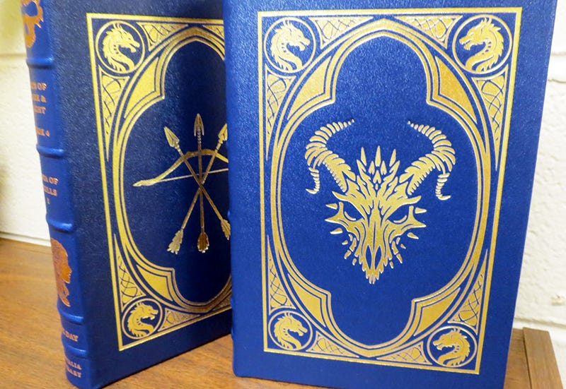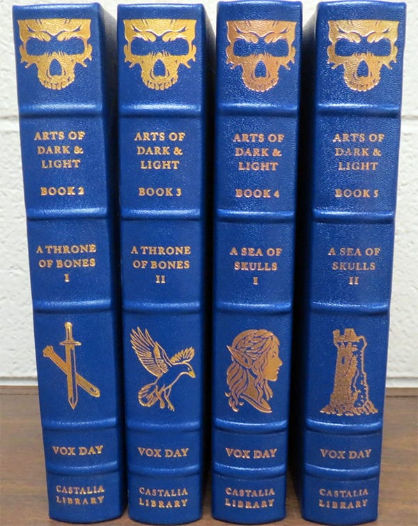 Both volumes of A SEA OF SKULLS have been bound in the US bindery and are out to our production specialist for quality control. We are cautiously optimistic that they’ll reach the warehouse toward the end of next week and begin shipping the week after that. ASOS Volume I features Bereth on the spine and her bow and arrows on the front, while Volume II features a ruined castle on the spine and a dragon skull reminiscent of the hardcover on the front.