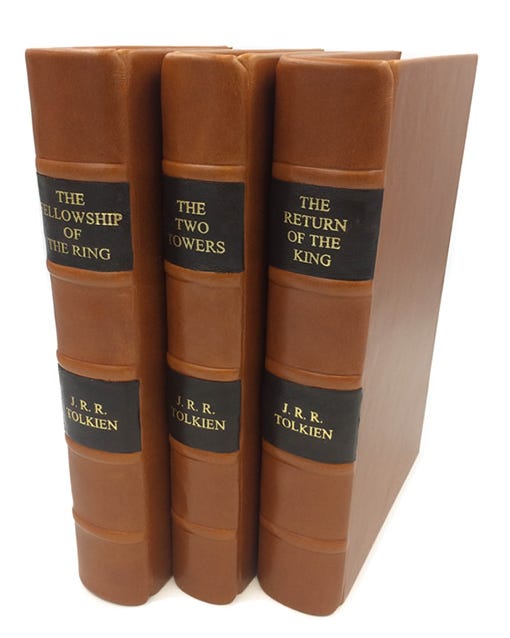 One way to do it is to repurpose high-quality new books, such as this LORD OF THE RINGS trilogy that was made from a set of the 2016 Folio Society edition. This is a nice approach because the paper that Folio utilizes is a less-deluxe, but still archival-quality version of the paper that we use on our own books. This approach will run around $300 per book, on average, for everything including the original book and a shared front cover stamp design.
