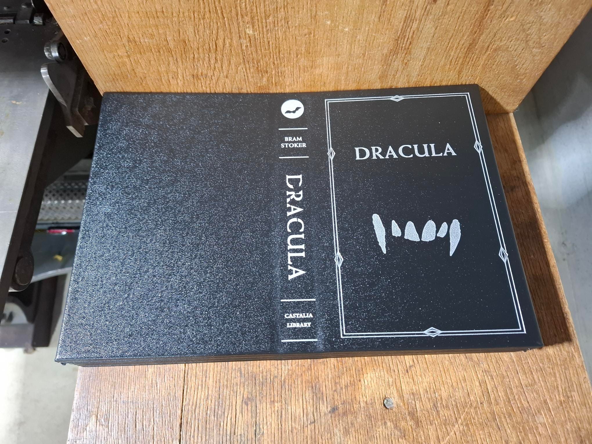 As you can see, we’ve begun stamping DRACULA. That’s not a stamping mistake on the D and the R, that’s where the red foil will appear. Obviously, we have to stamp all the silver before we stamp the red, so we’ll post the completed stamps when they’re done. However, if you look at the lines on the cover, you can see how clean and precise our newly-renovated press is operating.