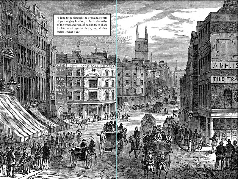 We considered going with silver moire endpapers, but in the end decided to go with the theme of the book, with images of London and Romania at the appropriate time inset with descriptive quotes from the text. The front endpapers show London of the period.