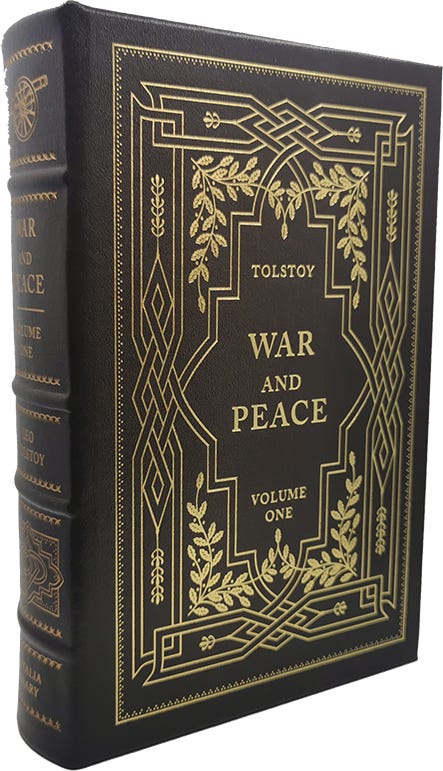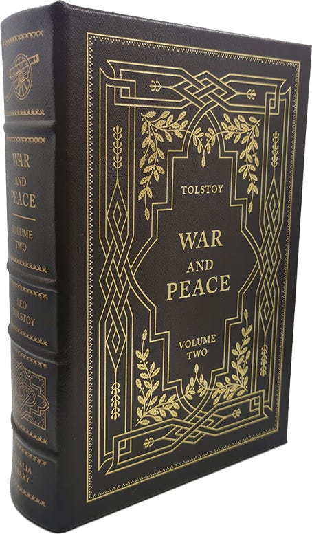 WAR AND PEACE by Count Leo Tolstoy is a massive tome that has been published as a single volume of more than 1,000 pages by other deluxe publishers, but anything over around 850 pages jeopardizes the integrity of the book due to the weight of the gilded pages which cause the book block to be gradually separated from the cover over time by gravity.