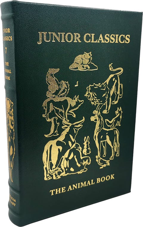 The Junior Classics 2020 Edition Volume 7: The Animal Book includes fables, tales by Beatrix Potter, tales of Brer Rabbit, stories of Animal Sagacity, and the modern classic The Parliament of Beasts and Birds by science fiction grandmaster John C. Wright.