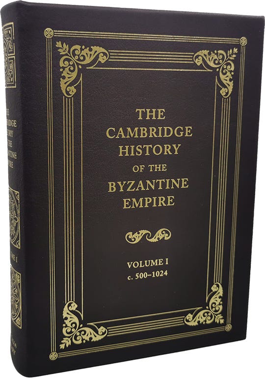 THE CAMBRIDGE HISTORY OF THE BYZANTINE EMPIRE: Volume I c. 500-1024, edited by Jonathan Shephard, was the first full print run to be bound at the Castalia Bindery in Switzerland. It is bound in a very fine Spanish cowhide leather of superlative quality, although unfortunately the exquisite leather is so supple that it did not hold the spine hubs very well, which is why this two-volume set is one of the few Library books that lacks them.