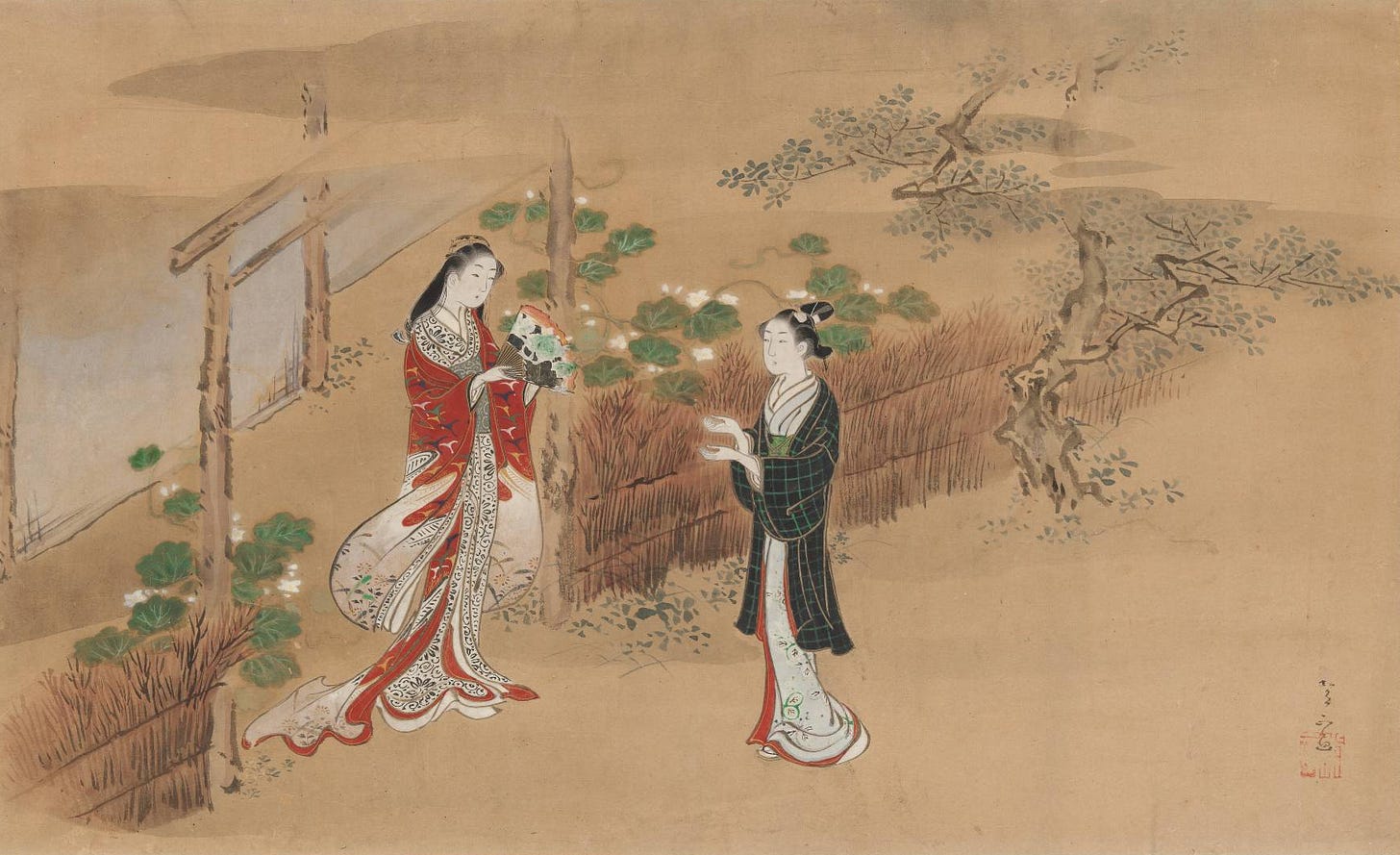 Original import: A woman has sent a poem via a white fan, punning on the evening-face flower and suggesting she perceives Genji’s radiance.