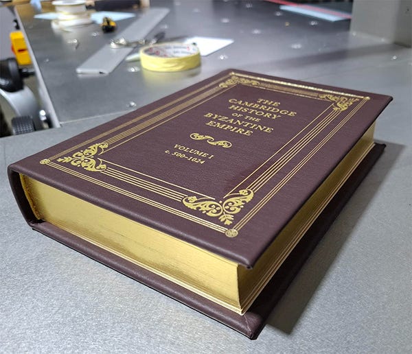 And here is a picture of the CAMBRIDGE HISTORY OF BYZANTIUM being prepped for binding at the Bindery. The finished book blocks are in the boxes, and the finished cases are stacked in front of them.