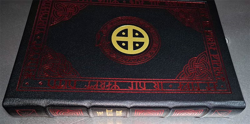 We will eventually do Signed First Editions of some of the other books that have been requested, but not until the first three are shipped. In the meantime, please enjoy the beautiful sight of our newly-perfected spine hubs on THE POETIC EDDA, a custom job for our friends at the Tamburn Bindery. They’re somewhere between the Easton and the Franklin standard in terms of projection and hardness.