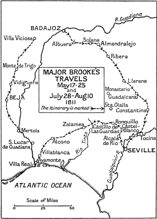 August 9th. From Beja, past Vidigueira, to Monte de Trigo, through a most romantic fine country, well wooded. (I am inclined to think that Brooke has here made one stage of two, as Monte de Trigo is no less than forty miles from Beja, which seems an incredibly long journey, when the mountains are taken into consideration. He calls the stage nine leagues in an analysis of his itinerary appended at the close of his Journal, but it is far more. - Oman)