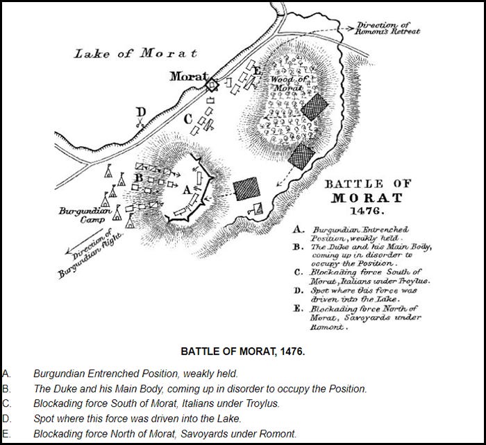 The Savoyard corps, under Romont, who had composed the duke’s extreme left, and were posted to the north of Morat, escaped by a hazardous march which took them round the rear of the Confederates.