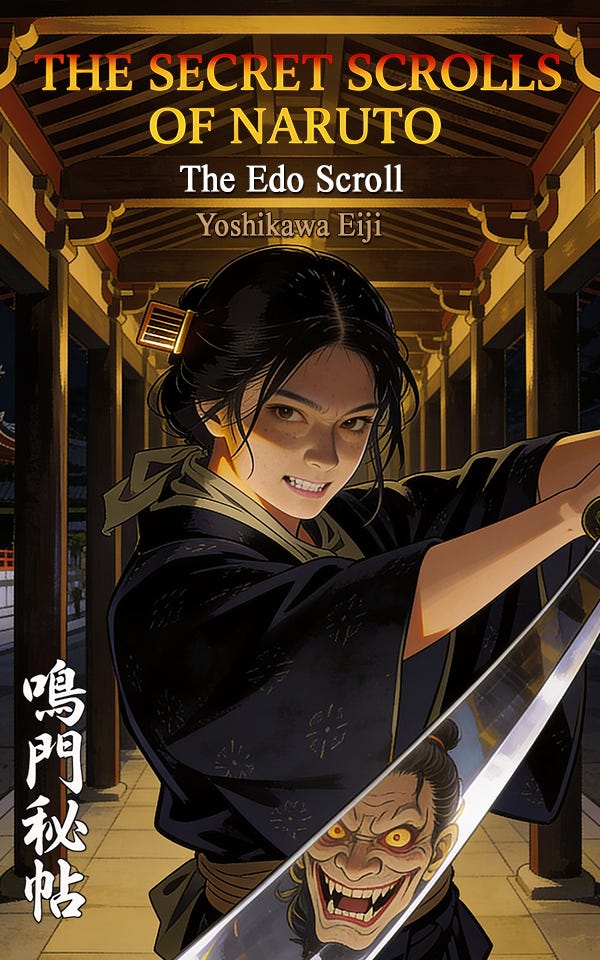 As the third release in our weekly translation schedule, we have completed the official English translation of 鳴門秘帖 江戸の巻, or THE SECRET SCROLLS OF NARUTO: The Edo Scroll, by Yoshikawa Eiji, who is best-known in the West as the author of MUSASHI. The ebook has already been sent out to the paid subscribers. For those who are not paid subscribers of this site but are interested in the new translation, the ebook is now available on Kindle, KU, and audiobook.